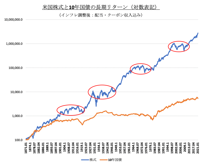【表1】は前回(No.1 積立神話 敢えて崩壊させてみる)にも登場した米国株式の150年チャートです。対数チャートですので、1目盛り毎に株価は10倍になっています。株価はインフレ調整後にしてあり、150年間で均せば年間2%前後のインフレ率を跳ね返しながら、年率+7%のリターンがあったことがわかります。年率+7%とは10年で倍となるペースであり、非常に魅力的なリターンと言えます。これだけ見れば、米国株式への集中投資は極めて合理的に見えるはずです。