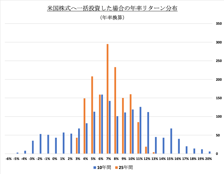一方で年率15%を超えるような大リターンも消滅しています。そして年率7%前後の平均的なリターンを手にした投資家が圧倒的に多くなっています。前述した通り、150年間にわたり米国株式に継続投資した場合の年率リターンは7%であり、25年間投資すれば、極端な“運”or”不運”が消滅し、平均値の出現確率が明らかに高くなっています。