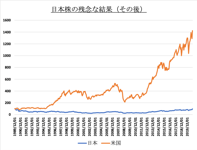まず米国株式を検証する前に、日本株が一番輝いていた時代を見てみましょう。89年バブルの当時、日本は様々な観点から脚光を浴びた時期でもあり、今から振り返れば最も輝いていた時代でした。