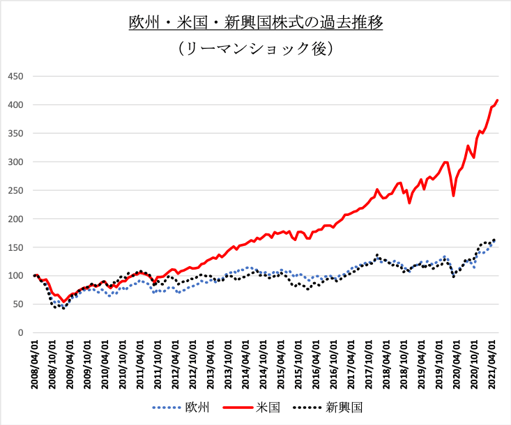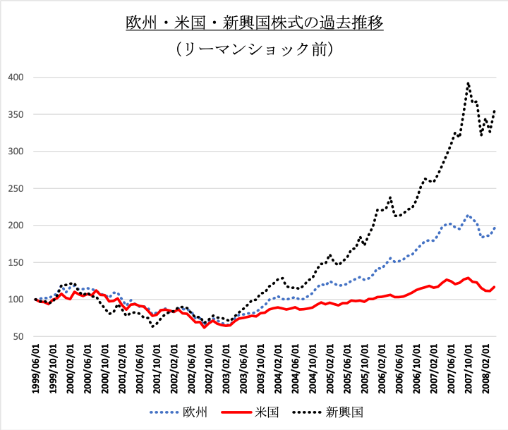 当時の新興国株式は米国、欧州等の先進国を圧倒し、その持続性を疑う人は少数派でした。先ほどの80年代の日本株と極めて似た状況です。意外に思われる方も多いかも知れませんが、当時の米国株式は日陰の存在でした。但し、新興国の大躍進は長続きせず、リーマンショック後は様変わりしています。米国株式の躍進が始まったのです。